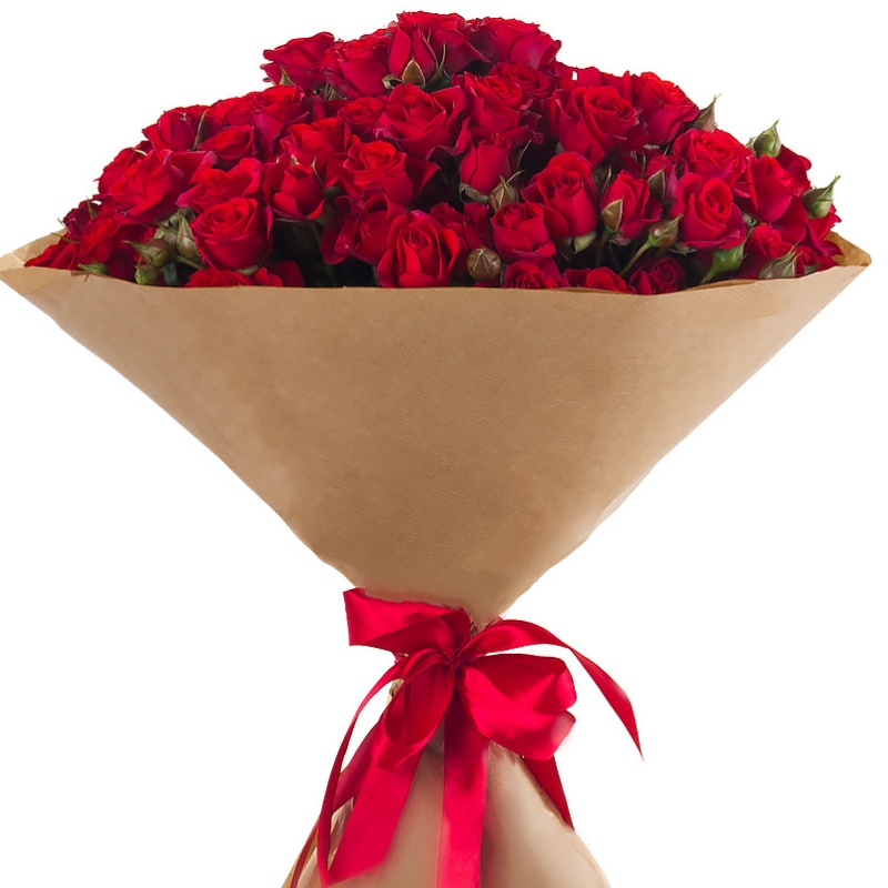 Букет состоит из 25 красных кустовых роз, крафт, атласная лента.