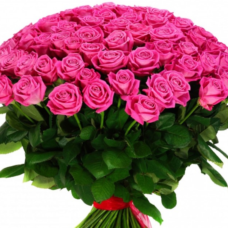 Букет состоит из 75 розовых роз, прозрачная упаковка, атласная лента.