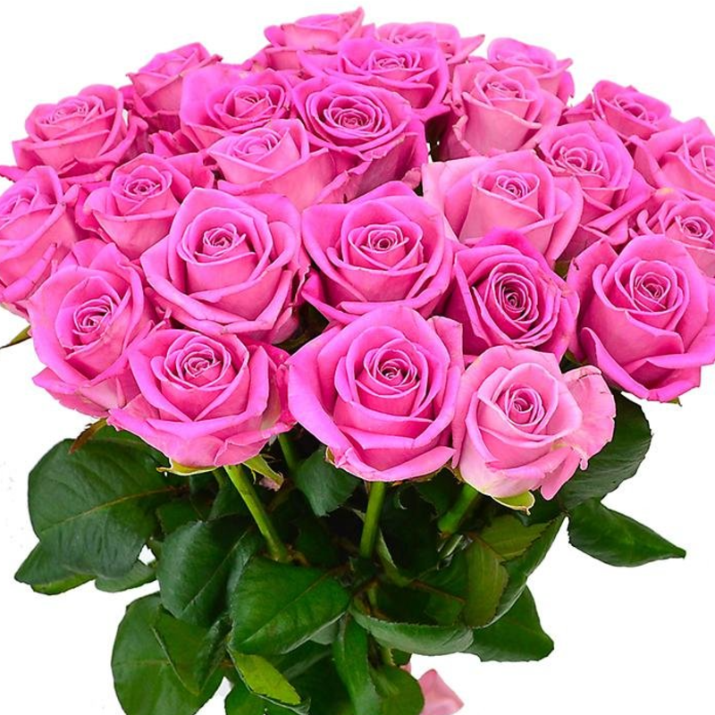 Букет состоит из 25 розовых роз, прозрачная упаковка, атласная лента.