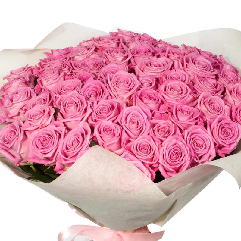 Букет состоит из 45 розовых роз, красивая упаковка, атласная лента.