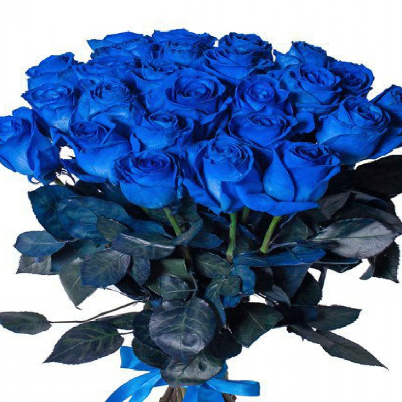 Букет состоит из 25 синих роз, прозрачная упаковка, атласная лента.