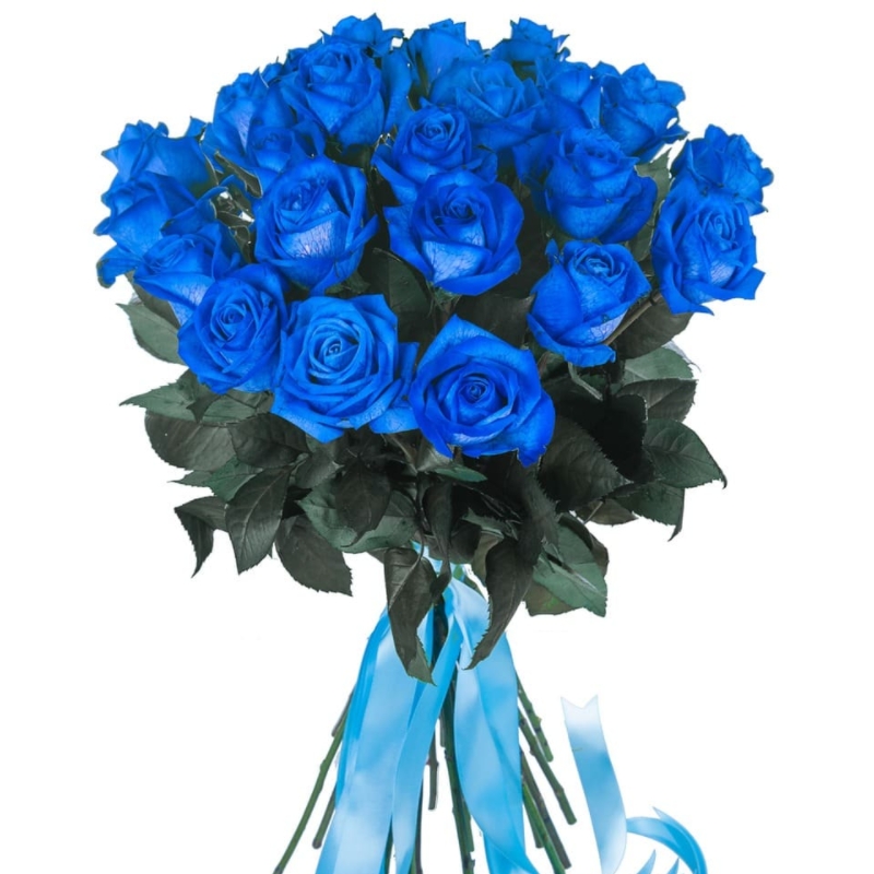 Букет состоит из 23 синие розы, прозрачная упаковка, атласная лента.