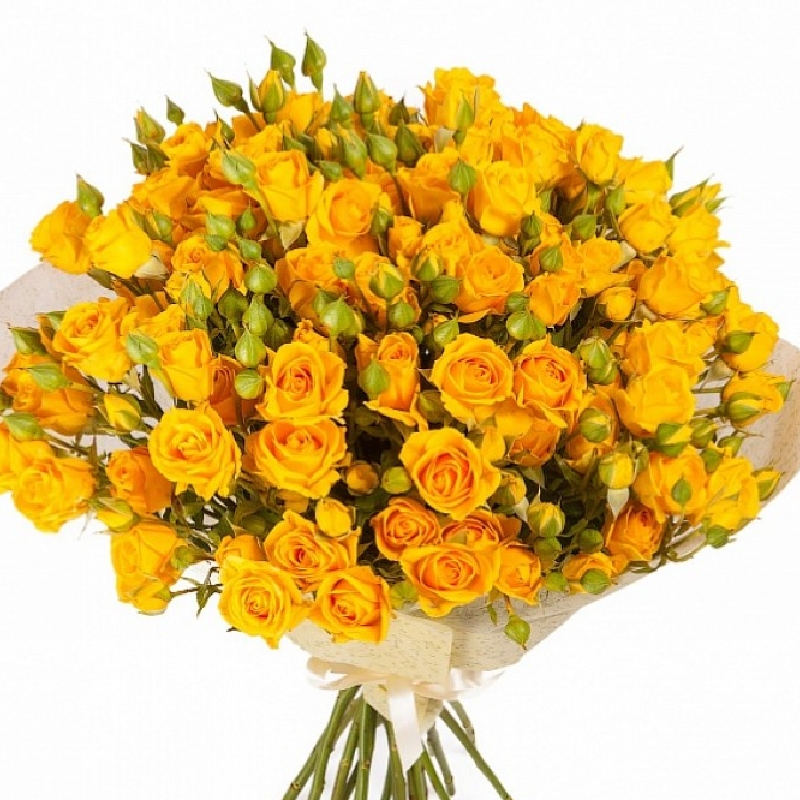 Букет состоит из 17 желтых кустовых роз, красивая упаковка, атласная лента.