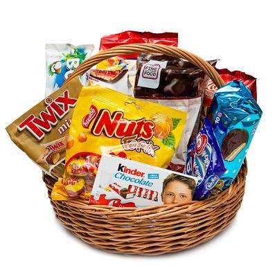 В состав входит печенье в упаковке - 5 видов, печенье шоколадное, конфеты Nuts, батончики Bounty и Milky Way, Twix minis, Kinder Chocolate.