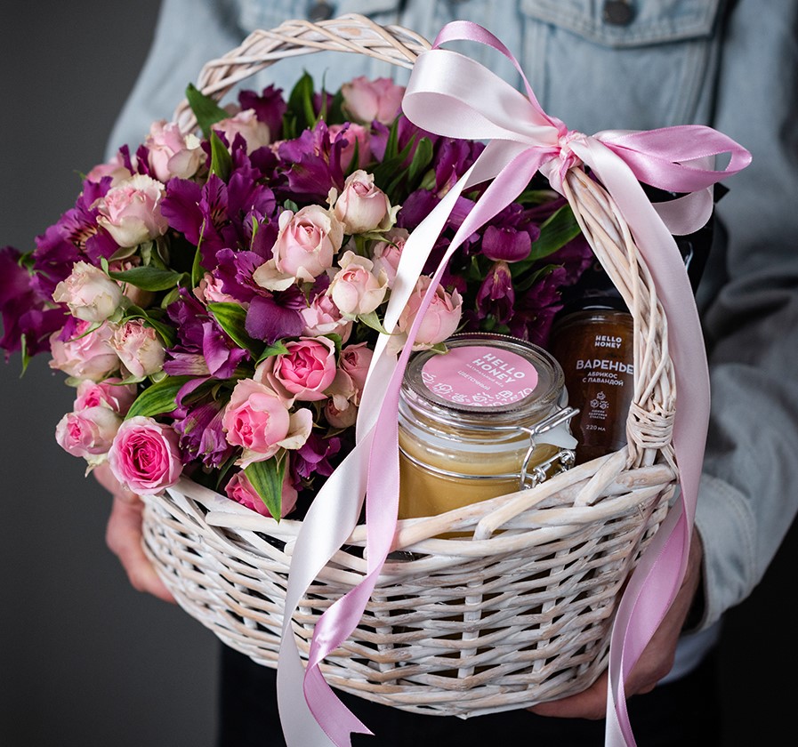 В набор входит натуральный мёд, домашнее варенье и пакет травяного чая. Настоящее украшение корзины — живые цветы альстромерии и кустовые розы. Это одни из самых красивых растений, которые не оставят равнодушной ни одну девушку. Хотите произвести впечатление? Этот подарок сделает всё за вас!